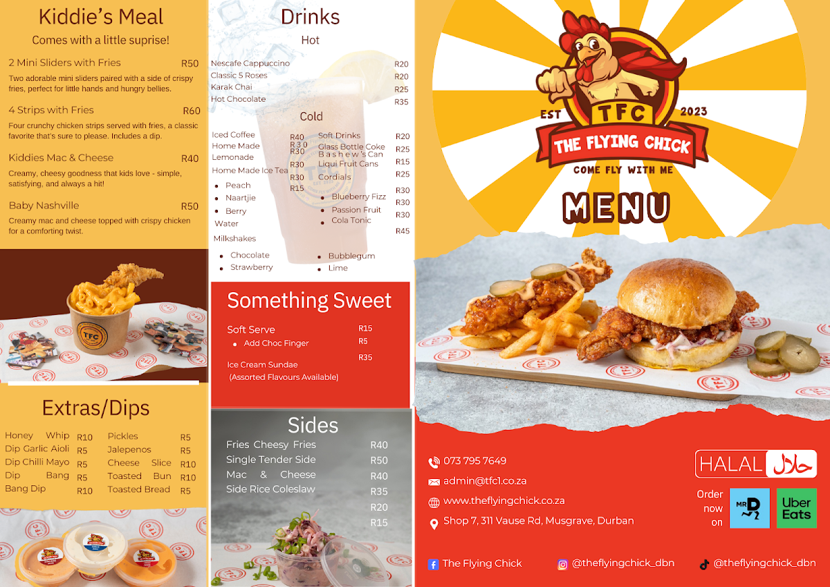 Welcome to The Flying Chick - Musgrave, a must-visit destination for chicken lovers located at 311 Vause Rd, Musgrave, Berea. This vibrant eatery stands out for its irresistible fried chicken, with many customers praising its crispy exterior and juicy tenderness. Popular items like the box combo and OG slider are frequently highlighted in rave reviews, making it clear that flavor is their forte. Customers have experienced great service, especially during pick-up, complemented by the added convenience of ample parking.